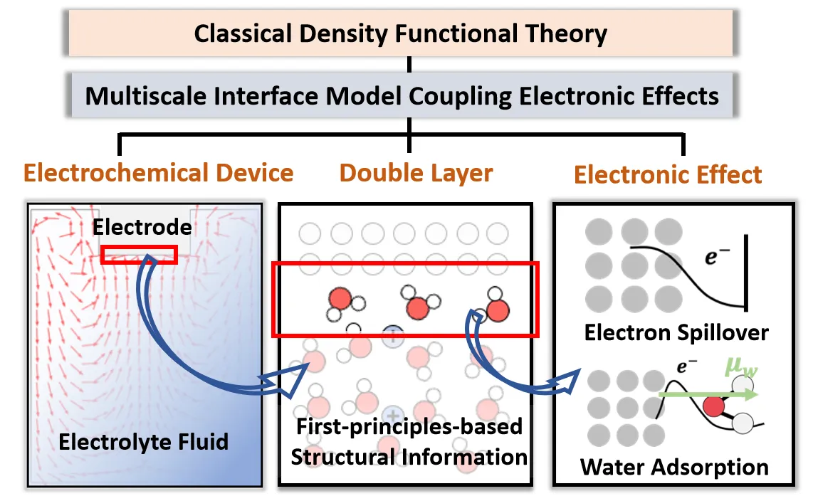 Understanding electrochemical interfacial processes remains a fundamental challenge due to the multiscale spatiotemporal coupling (mass transport, momentum transport, electrochemical reaction, etc.) between the electrochemical double layer and bulk phases. By combining classical density functional theory and atomic structural information from first-principles calculations, we developed an electrochemical model that bridges atomic-scale interfacial phenomena with macroscopic electrochemical behavior at metal-aqueous solution interfaces under experimental conditions. Our model takes into account the critical interfacial effects, including microscopic double-layer effects, mesoscopic mass transfer, and macroscopic fluid flow. At the microscopic level, key interfacial effects include the quantum effects (metal’s electron spillover, adsorption-induced effects of water molecules/ions), solution effects (excluded volume effect and dielectric saturation effect), and redox reactions. In particular, quantum effects are crucial for metal-aqueous solution interfaces. Our model successfully reproduces the experimental differential capacitance curves for the Ag electrode in dilute electrolytes, quantifying the contribution of these effects. Moreover, the study of the hydrogen evolution reaction in dilute electrolytes demonstrates an analytical capability for electrochemical polarization curves across varying experimental conditions. This computationally efficient model enables multiscale interface simulations under experimental conditions, which were previously inaccessible to either atomistic simulations or traditional continuum models. Thus, it provides an improved approach for investigating physicochemical processes in electrochemical systems for energy storage and microelectronics applications.
